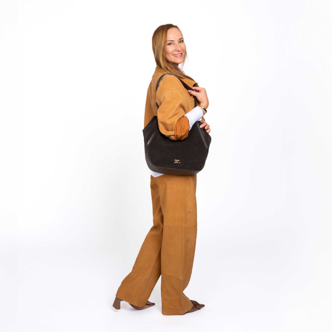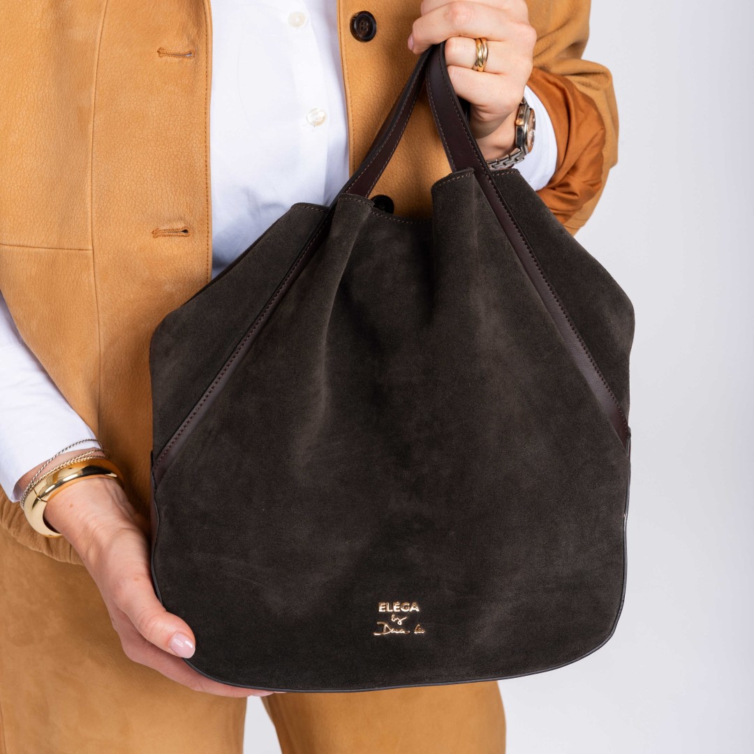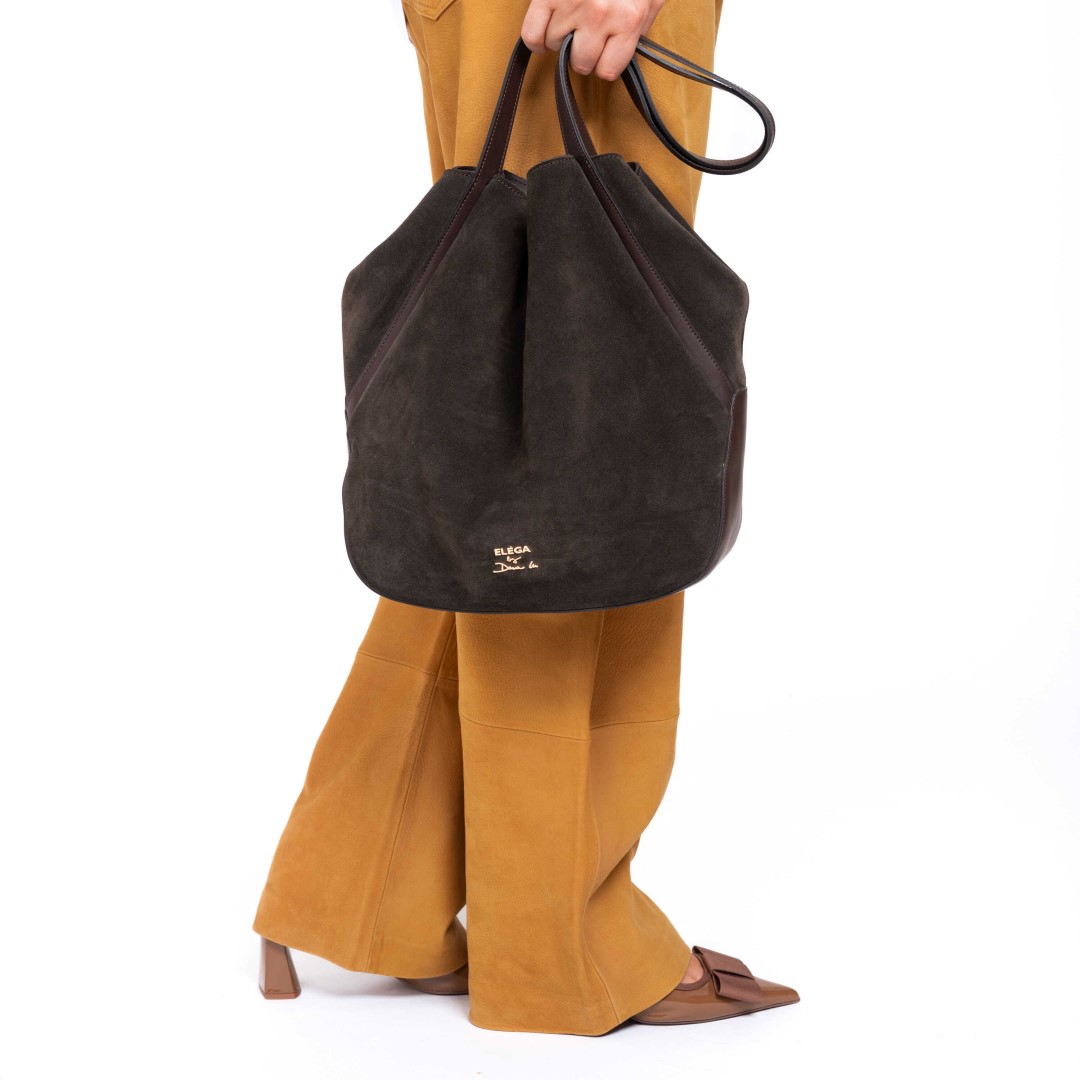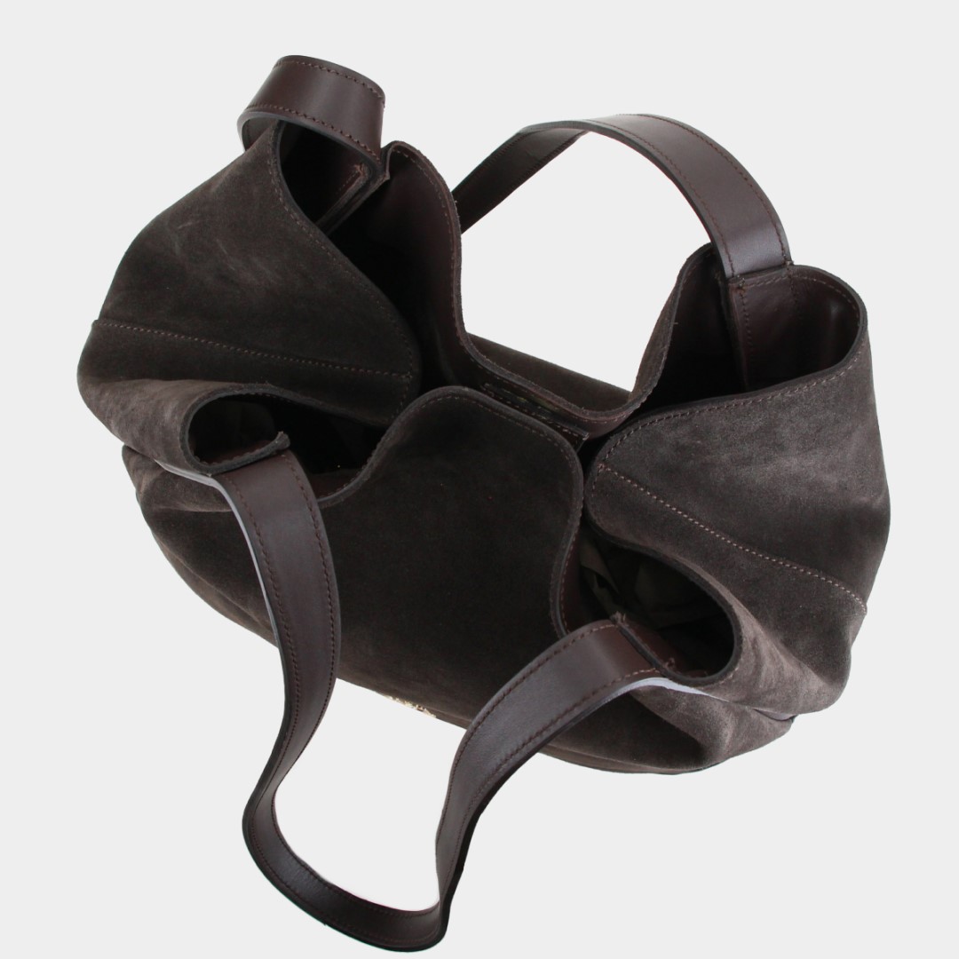 Vyrobena z velurové kůže v kombinaci s hladkou kůží Nappa ve stejném tónu. Její pevný a vyztužený tvar (dno + stranice) zajišťuje stabilitu, avšak pro zachování struktury a funkčnosti je důležité ji nepřetěžovat, aby nedošlo k poškození vnitřní výztuhy. K prodloužení životnosti a zachování půvabu velurové kůže doporučujeme impregnaci speciálním přípravkem např.od značky Collonil.